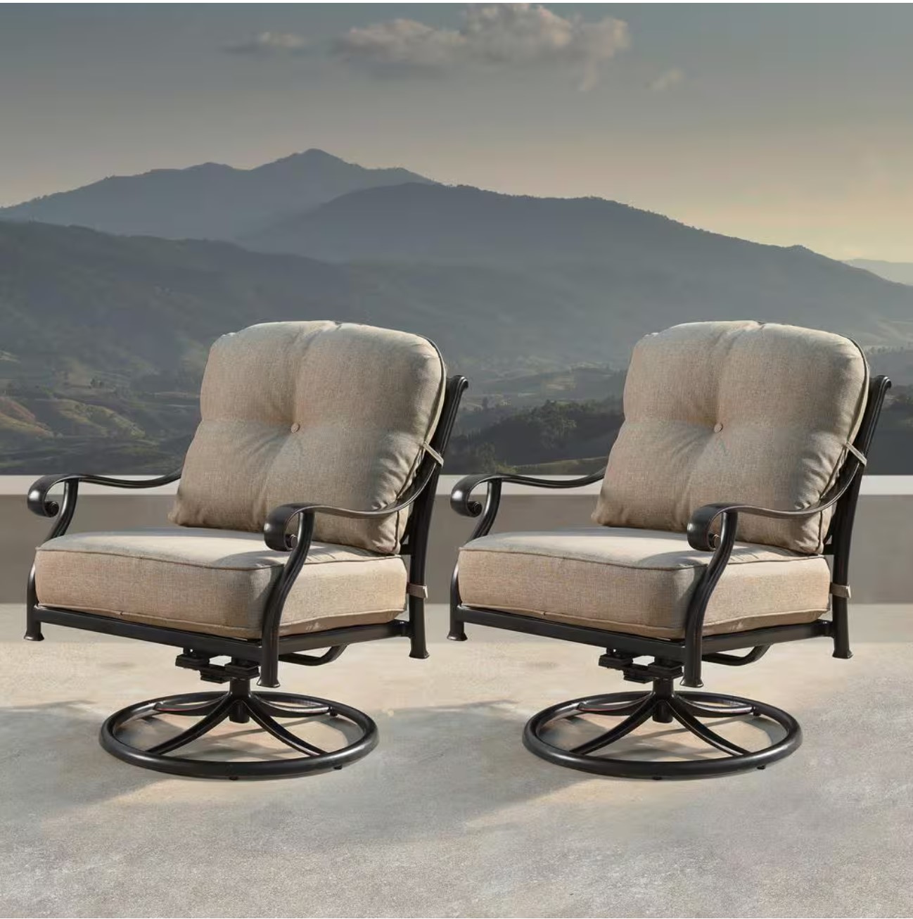 Add style to your outdoor living area with our newly integrated 360° aluminum swivel rocking club chairs for relaxation. Durable, weather resistant materials are paired with deep seating for comfort, providing you with years of enjoyment in your outdoor space. 3 Layer weatherproof foam cushions deliver superior comfort while allowing moisture to completely drain. Made from high quality and durable materials. Virtually maintenance free. Just wash with a hose and mild cleanser. A perfect addition to any area of your home. Swivel rocker club chairs comes in a set of 2 with both seat and back tan cushions for each chair. Dimensions per chair are: 28.3 in. L x 33.8 in. W x 34.2 in. H, 29 lbs. each. The seat height from the floor is 12.6 in. Cushion dimensions each: 25.6 in. L x 27.6 in. W x 5.9 in. H, 10 lbs.