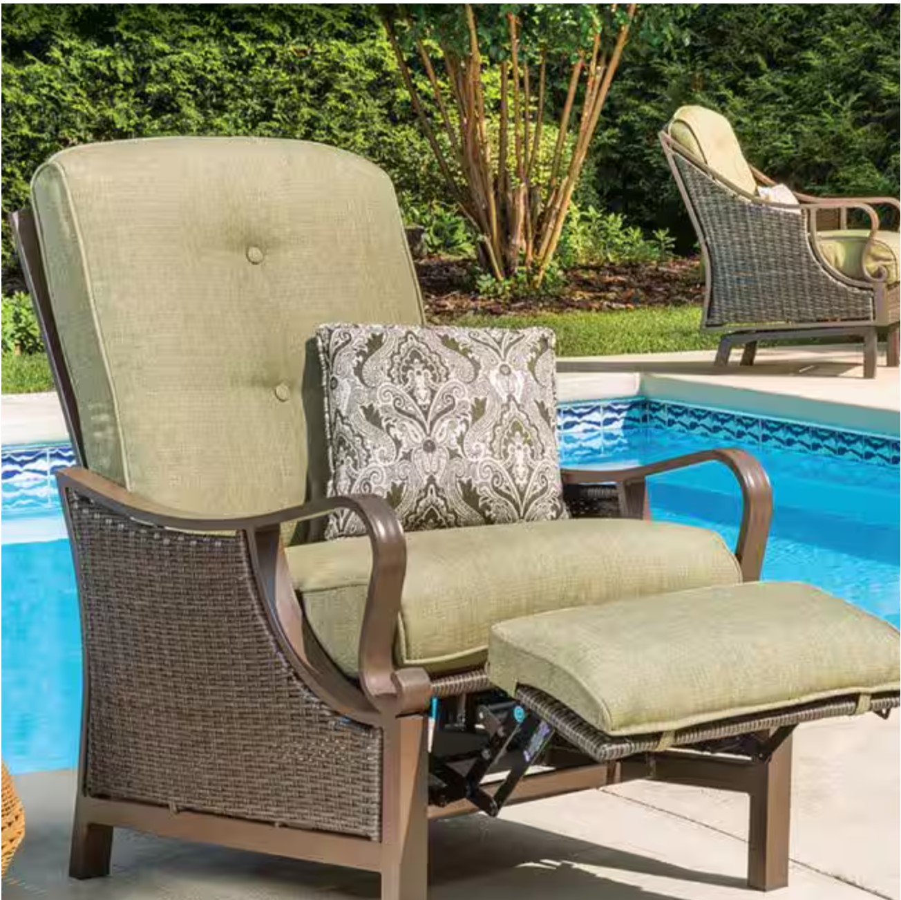 Strathmere Collection by Hanover includes stylish and elegant hand-woven wicker furniture with high quality cushions and a toss pillow, this recliner is made of heavy duty, steel rust-resistant frames with UV protection for all-weather use, perfect addition to your patio, yard, deck, or porch